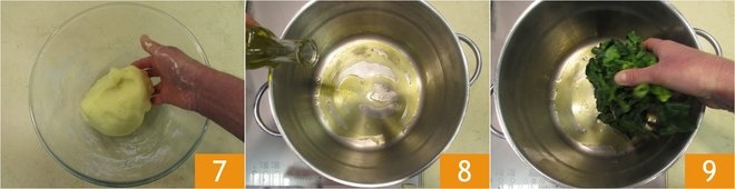 Let the dough absorb the oil 7, then leave to one side. Add a drizzle of oil to a large pan, followed by the previously washed spinach 9.