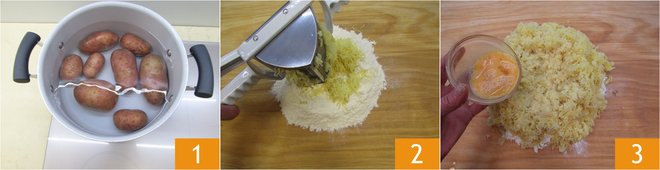 To make potato chicche with taleggio cheese, mushrooms and sausage, start by preparing the chicche: wash the potatoes without peeling them, place them in a pan with salted water and boil them 1. Peel and mash them with a potato masher while still hot, then place them on a work top, where you will have already added the flour, shaped into a well 2. Add one egg 3 and knead.