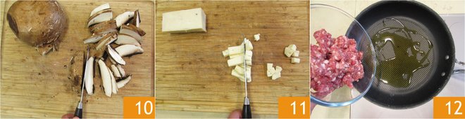 Clean the mushrooms with a cloth and remove the soil-covered tip, then cut into slices 10. Dice the taleggio cheese 11. Heat a drizzle of oil in a pan, add the sausage 12 and brown for 3-4 minutes on a high flame.