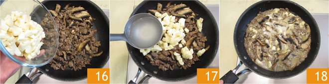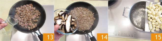 Add the white wine 13, simmer and reduce, then add the mushrooms 14 and cook for around 3-5 minutes. In the meantime, bring the water to the boil and add the chicche 15.