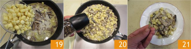 As the chicche rise to the surface, drain and add them to the pan 19. Lastly, add the thyme leaves and flavor with a sprinkling of black pepper 20. Potato chicche with taleggio cheese fondue, mushrooms and sausage are ready 21.