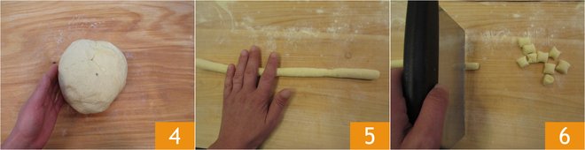 Do not knead for too long otherwise the mixture will harden, just enough to form a single piece 4. Remove parts of the dough and shape them into strips that are roughly 0.4 inches thick 5. Cut each strip into 0.6 inch pieces using a knife (or a spatula) 6.