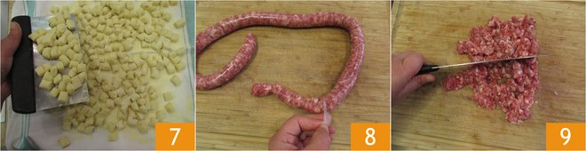 Place the chicche on a tray dredged with the semolina 7. Decase 8 and with a knife, coarsely chop the sausages; leave to one side 9.
