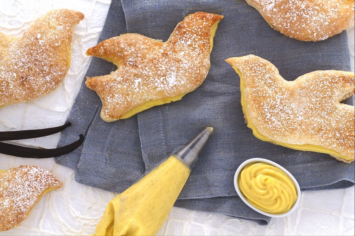 What is one of the symbols of Easter? The famous dove and olive branch, without a doubt. In line with tradition, we've decided to prepare these puff pastry doves. These small yet delicious treats are perfect for adding an original touch the most traditional Easter menus and for decorating the table, together with colorful Easter cookies. Made with puff pastry and filled with cream, the puff pastry doves are small sweets that revoke the symbols of Easter. Their dove shape, a symbol of peace and hope, makes these puff pastry treats an original idea for enriching a sweet Easter buffet!