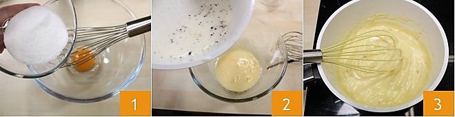 To prepare puff pastry doves, start by making the pastry cream: heat the milk in a saucepan with half a vanilla bean and its seeds; beat the egg yolk and sugar together in a bowl 1 with a whisk, then add the flour (or you can use corn starch instead). Remove the vanilla bean using kitchen tongues, gradually add the heated milk to the mixture 2 and stir with a whisk. Place the mixture back on the stove and stir continuously until it thickens 3. Place the pastry cream in a bowl and leave to cool after covering with plastic wrap.