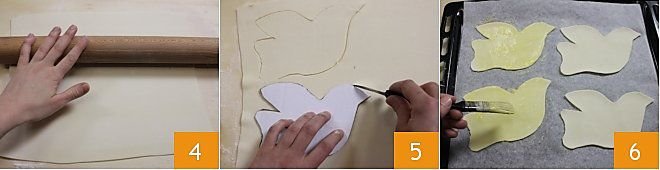 After preparing the pastry cream, take the puff pastry, sprinkle the work top with abundant flour and gently roll the pastry out with a rolling pin 4. Click here to download the dove-shaped mold, cut it out from stiff material, like cardboard, place it on the puff pastry and cut the doves out by running a knife around the edge of the mold 5. Once you have cut out the colombine, place them on an oven tray lined with parchment paper and use a brush to dab with an egg beaten with a spoon of cream (or milk) 6.