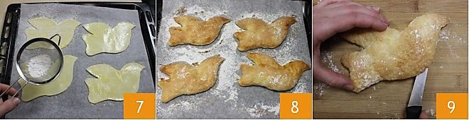 After dabbing them with a brush, sprinkle the powdered sugar over the colombine 7 and bake in an oven preheated to 356°F (180°C) for 20 minutes (for around 15 minutes in a convection oven). Remove from the oven and leave to cool 8. Once cooled, delicately cut your doves in half 9.