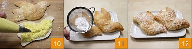 Place the pastry cream in a star-tipped pastry bag and fill the dove 10. Close it with the top half of puff pastry and dust with the powdered sugar 11. Your puff pastry doves are ready 12, all that's left for you to do now is serve them!