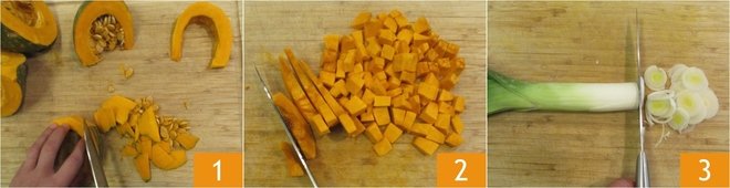 To make the pumpkin soup, first, clean the pumpkin 1 and cut 2.2 lbs of flesh into cubes 2, then slice the leeks into rounds 3.
