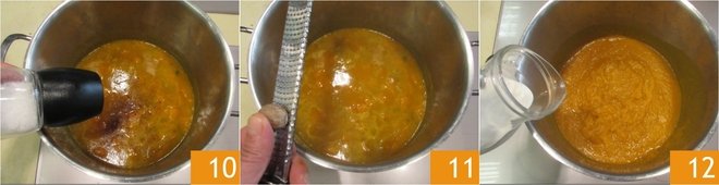 When the pumpkin is very soft and almost disintegrated, adjust the seasoning with salt 10 and pepper, then flavor with nutmeg 11. At this point, add almost all the cream 12, keeping a little aside for the final decoration.
