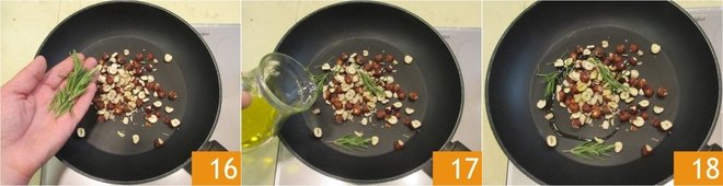 Pour the hazelnuts into a pan along with the rosemary 16 and a drizzle of oil 17 and toast for a few minutes 18.