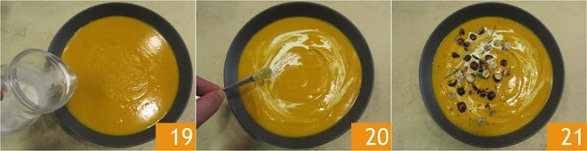 Garnish the dishes with the cream set aside 19, stir lightly 20 and complete with the toasted hazelnuts and a few sprigs of rosemary: your pumpkin soup is ready to be served 21!