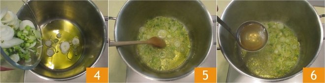 Heat the oil in a large pot, add the leeks and sauté for a few minutes over medium-low heat 4, stirring to prevent them from burning 5. If necessary, you can add a ladle of hot broth 6.