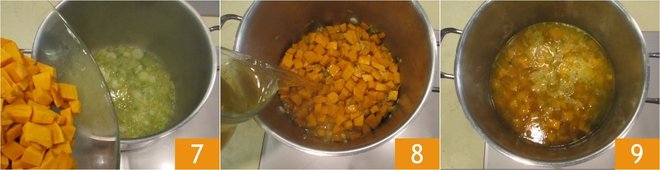Once the leeks are well sautéed, add the pumpkin 7 and stir for a few minutes to flavor it, then cover with the hot broth 8. Cook the pumpkin, stirring often, it will take about 25-30 minutes 9.