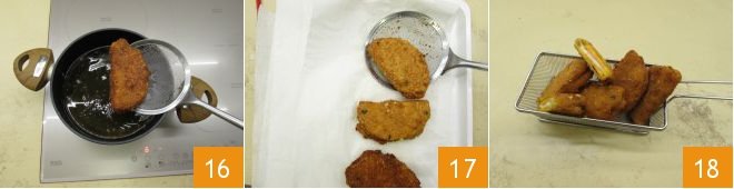 Place on a tray 13 and repeat for all the other pieces. In the meantime, heat the oil to 290°F (145°C). Once heated to the right temperature, use a skimmer to place the first cordon bleu in the oil 14 and cook for around 5 minutes 15,