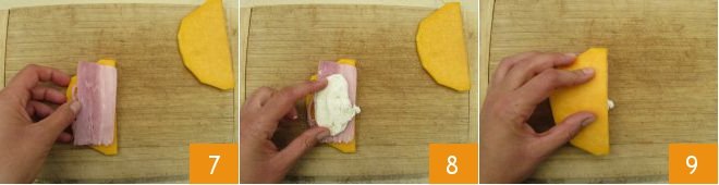 Place half a slice of cooked ham 4 on the first pumpkin slice, then add a slice of mozzarella cheese 5. Top with another pumpkin slice 6. Repeat with the remaining slices.