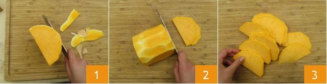 To make pumpkin cordon bleu, start by peeling the pumpkin 1. Then cut it into slices that are around 0.2 inches thick 2. You should end up with 12 3.