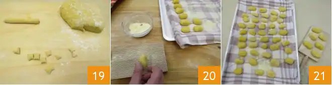 Once it has rested, dust the work surface with a little flour and take a small piece of dough. Work it into a baton and cut it into small bite-size pieces of around ½ inch to ¾ inch (1.5-2 cm) 19 in size. Repeat with the rest of the dough. Now, roll the gnocchi one at a time over the prongs of a fork or a gnocchi board to give them their classic ribbed surface 20, placing each one on a floured tea towel 21 once shaped. Your pumpkin gnocchi are now ready to be used! To use, cook one portion at a time in boiling water, allowing them to rise to the surface. As soon as they surface, remove them with a slotted spoon, drain thoroughly, and enjoy!