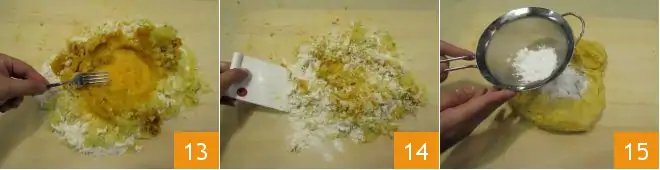 Mix the egg into the dough using a fork 13 and work it using a pastry dough slicer 14 until the mixture is consistent. Knead the dough as little as possible and quickly. Work it into a patty and sift the starch 15 over it to soften it.