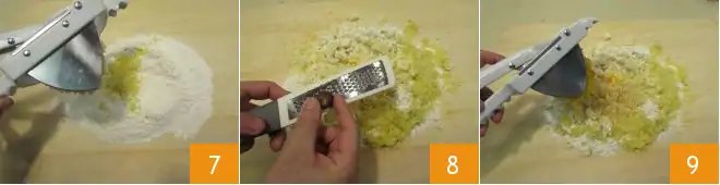 Peel the potatoes while still hot. Pass them through a special potato ricer 7, seasoning the mixture with salt and pepper to taste and a pinch of nutmeg 8. Next, pass the pumpkin through the potato ricer 9 while still hot.