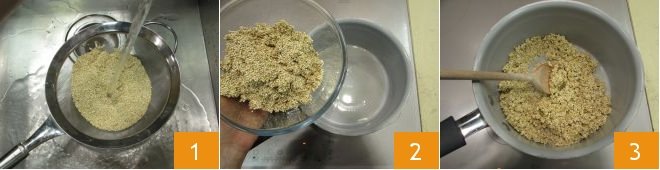 To prepare the quinoa, zucchini, and stracchino bites, start by removing the saponin. This is a substance on the quinoa, so just pour it into a colander and rinse it off 1. In a saucepan, pour a little olive oil 2 and toast the quinoa for a few moments while stirring continuously 3.