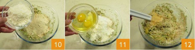 the breadcrumbs, and Parmigiano Reggiano cheese 10, and finally the eggs 11. Initially, mix everything with a spatula 12