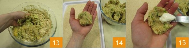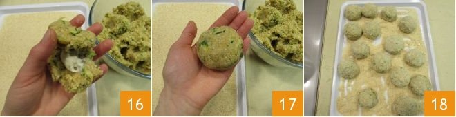 and cover with a bit more mixture 16 and seal the balls well to prevent the cheese from leaking out 17. Roll the balls in the breadcrumbs and proceed with cooking 18.