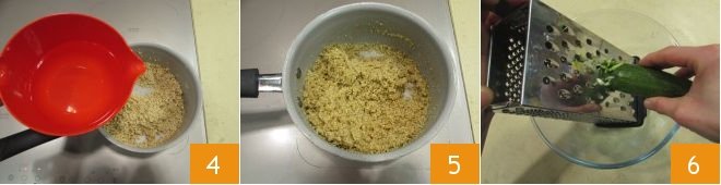 Cover with water, add salt, and bring to a boil 4. Stir occasionally and cook for about 15 minutes: by the end of the cooking, the water should be completely absorbed 5. Turn off the heat and let it cool for about ten minutes 5. In the meantime, you can take care of the rest. Wash and dry the zucchinis, then trim and grate them with a coarse grater 6.