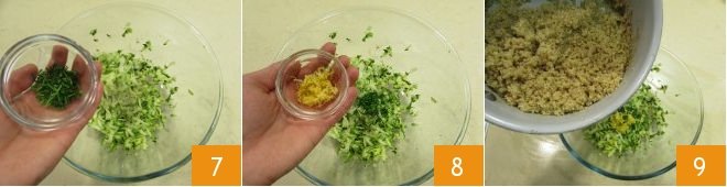 Season with salt and pepper, then add the chopped chives using scissors 7 and the grated lemon zest 8. At this point, also add the now lukewarm quinoa 9,