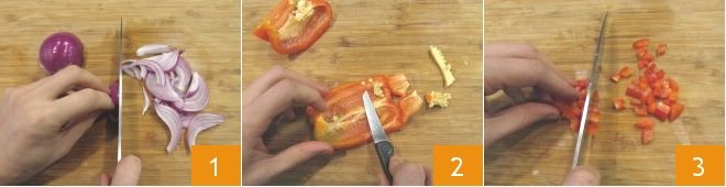 To prepare quinoa with vegetables, start by cleaning the red onions, cutting them in half, and then thinly slicing them 1. Halve the red bell pepper and scrape out the seeds 2. Then dice it into small cubes 3,