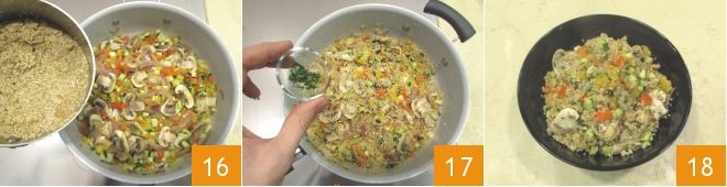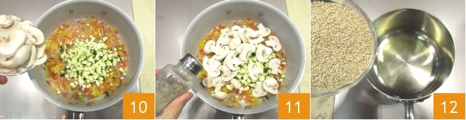 mix and cook for a couple of minutes before adding the zucchini and mushrooms 10. Cook everything for another 5 minutes, seasoning with salt and pepper 11: your vegetables are ready and beautifully crispy! Now take care of the quinoa: rinse it thoroughly to remove the saponin layer that forms the outer coating, then heat a drizzle of oil at the bottom of a saucepan and toast the quinoa 12.
