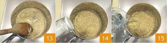 Stir with a wooden spoon to prevent it from sticking 13, season with salt 14, and continue cooking by covering with the remaining water: its volume should be twice that of the quinoa 15.