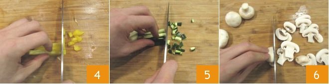 and repeat the same cut for the yellow bell pepper 4. Dice the zucchini as well 5 and finally clean the mushrooms and slice them 6.