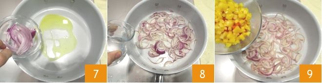 Heat a drizzle of oil in a saucepan 7 and add the onions first. Let them stew slowly, deglazing with a bit of water when they start to turn golden 8, and continue cooking for a few more minutes until they are very tender. At that point, add the bell peppers 9,
