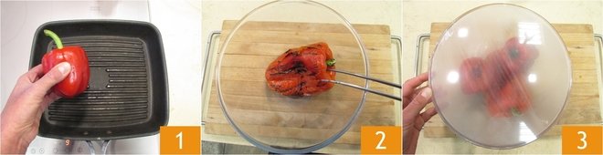 To prepare rice salad with roasted peppers and mozzarella cream, start by heating a saucepan filled with salted water, which you'll need for cooking the rice. Now thoroughly wash the peppers, place them on a hot grill 1 and cook until soft and nicely golden; turn them over often. This will take around 20-25 minutes. Place them in a bowl 2 and cover with plastic wrap 3 to make it easier for you to remove the skin later on.