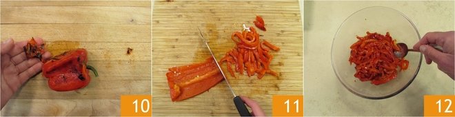 Skin the peppers, they should have cooled down by now 10. Open them in half, remove the seeds and stalk. Then cut into strips roughly 0.2 inches in size 11. Place them in a bowl and season with salt, oil and pepper 12.