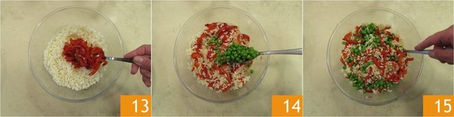 Add the roasted peppers and their condiment to the rice 13, as well as the peas, after removing the peperoncino 14. Stir everything thoroughly together 15 and leave to one side to flavor.