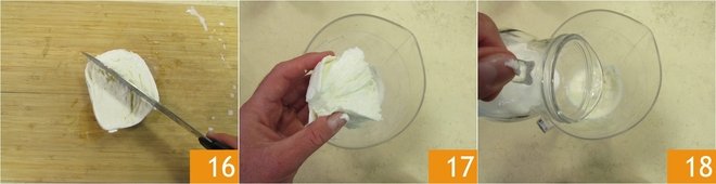 Now prepare the mozzarella cream. Cut the fiordilatte cheese into pieces and place it in a tall and narrow container 17. Then add the cream 18 and blend.