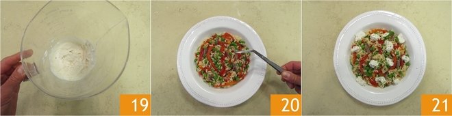 You should obtain a smooth and thick cream 19. Place the lukewarm rice on dishes with the peppers and peas, add the copped anchovies 20 and decorate with the mozzarella cream and fresh mint leaves 21.