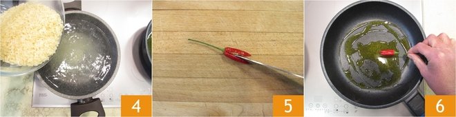 Add the rice to the water as soon as it comes to the boil 4 and cook for around 12 minutes. Drain thoroughly and place it in a large bowl to cool. In the meantime prepare the peas too. Cut into the peppers 5 and place them in a pan with a drizzle of oil 6.