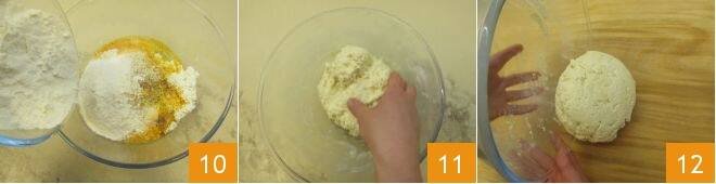 Finally, gradually add the flour 10, so you can adjust the consistency. Work briefly with a spatula to mix, once you have added all the flour, knead quickly by hand on a work surface dusted with a little semolina 11, just long enough to obtain a homogeneous dough; otherwise, the gluten mesh will develop. Transfer the dough to a work surface 12. Before starting to make the gnocchi, put a large pot with plenty of water on the heat and salt it when it boils.