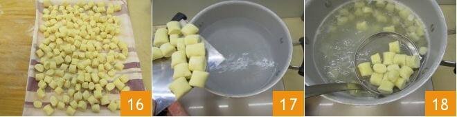 Once you have finished 16, cook your ricotta gnocchi in 3 batches, to avoid overcrowding the pot and ensuring they cook perfectly. So, pour some into the pot with boiling water (boil over moderate heat so that the water simmers during the gnocchi cooking and does not boil violently) 17, until they rise to the surface; it will take a few moments, then scoop them out with a slotted spoon 18.