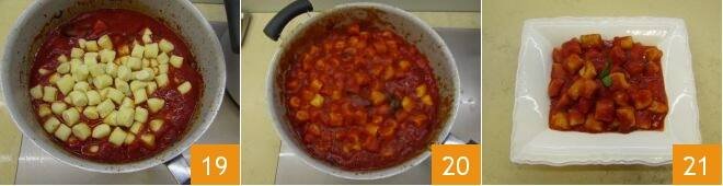 Turn the medium-low heat on under the saucepan with the sauce, then as they are ready, pour in the gnocchi 19; stir and continue cooking to let them absorb the flavor, it will only take a few moments 20. Once ready, quickly serve your ricotta gnocchi 21.