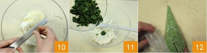 Flavor with nutmeg 10 and add the chopped spinach 11: mix the ingredients well and transfer the mixture to a disposable pastry bag (you can cut the tip quite wide) 12 and set aside.