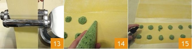 Take the fresh pasta dough and remove the plastic wrap. Lightly floured the dough with semolina and divide it into two equal pieces. Cover one of the two pieces with plastic wrap and take the other one. Pass it between the rollers 13, setting the machine from the widest roll to the narrowest until you obtain a rectangular sheet with a thickness of about 2 mm (the thickness of a nickel) and 10 cm (4 inches) wide. Then roll the second piece of dough through the pasta machine in the same way. Place them on a work surface lightly floured with semolina. Then, using the pastry bag, place small dollops of filling on one of the two pasta sheets, about 3 cm away from each other 14. Spray or, if you prefer, brush the edges of the pastry with a little water: this will allow the two sheets to better stick together 15.