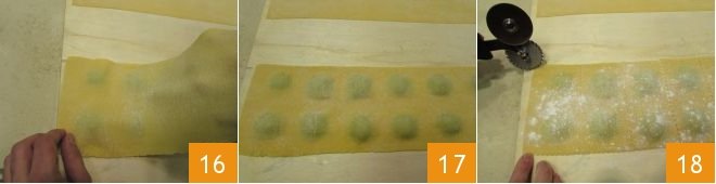 Lay the other sheet on top, making sure they match and stick at the edges 16: to avoid breaking the ravioli while cooking, let the air out between one raviolo and the next, exerting light pressure with your fingers from the center of the filled raviolo outwards 17. Then take a notched pastry wheel and make 24 ravioli of 4x4 cm (1.6x1.6 inches) 18.
