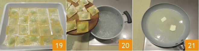 As you cut the ravioli, place them on a tray lightly floured with semolina and spaced apart so that they do not stick together 19. Now bring a pot with salted water to a boil and add the ravioli as soon as it boils 20. While the ricotta and spinach ravioli are cooking, melt the butter in a pan over very low heat 21.