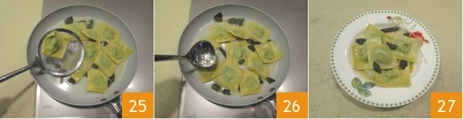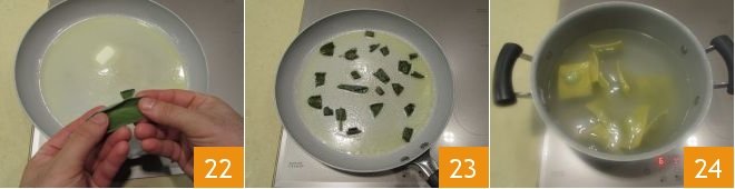 Add previously-washed, roughly chopped sage leaves 22 and mix the ingredients 23. At this point the ravioli that come up to the surface of the water are ready 24.