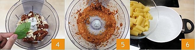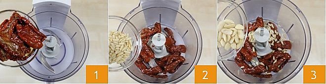 To prepare rigatoni with sun-dried tomato pesto, start by preparing the pesto. Pour the sun-dried tomatoes into the mixer without draining off any of the oil they’re preserved in 1, then add the pine nuts 2 and peeled almonds 3.