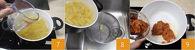 Remove about 5 fl oz (150 ml) of cooking water and set aside 7. Then drain the pasta two minutes before the cooking time stated on the package is up 8. In the meantime, take the pesto and place it in the saucepan where the pasta was cooked 9, adding a little cooking water to make it creamier.